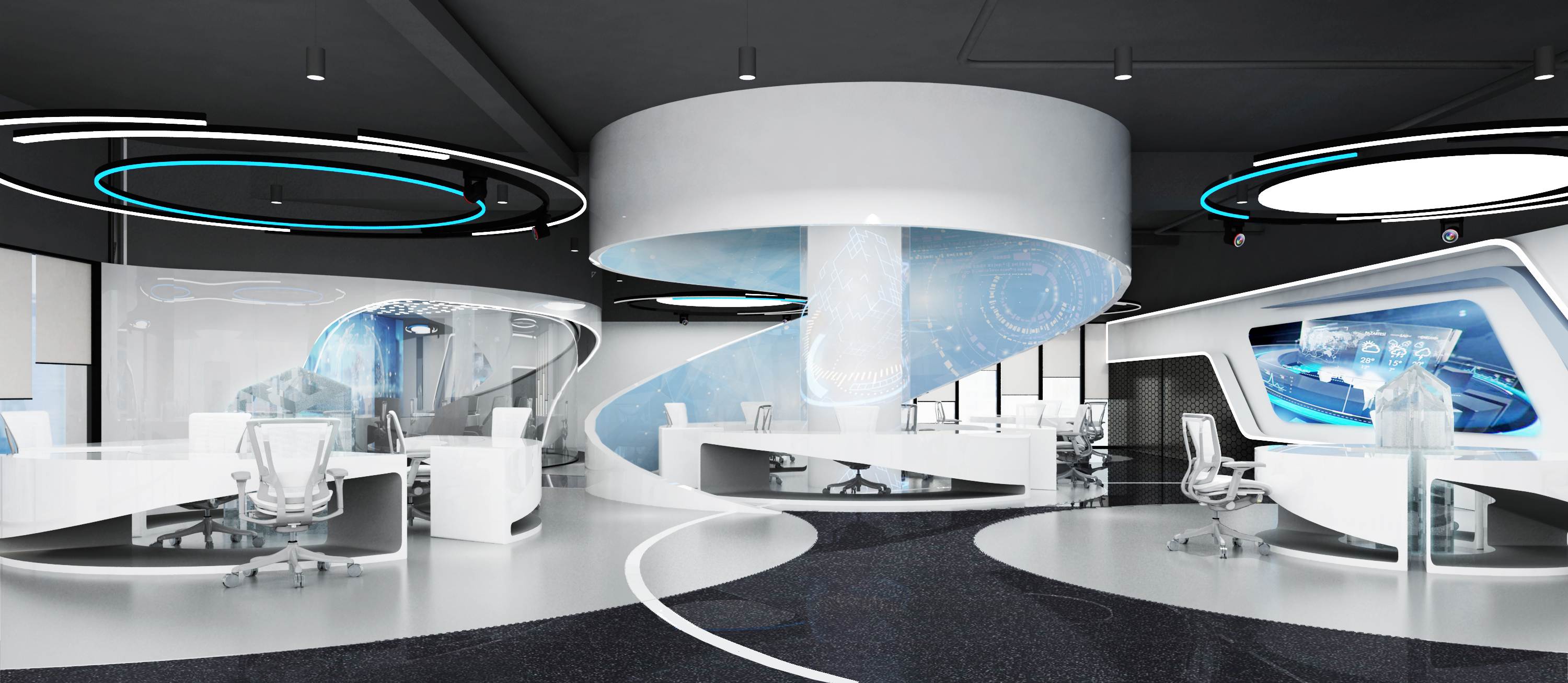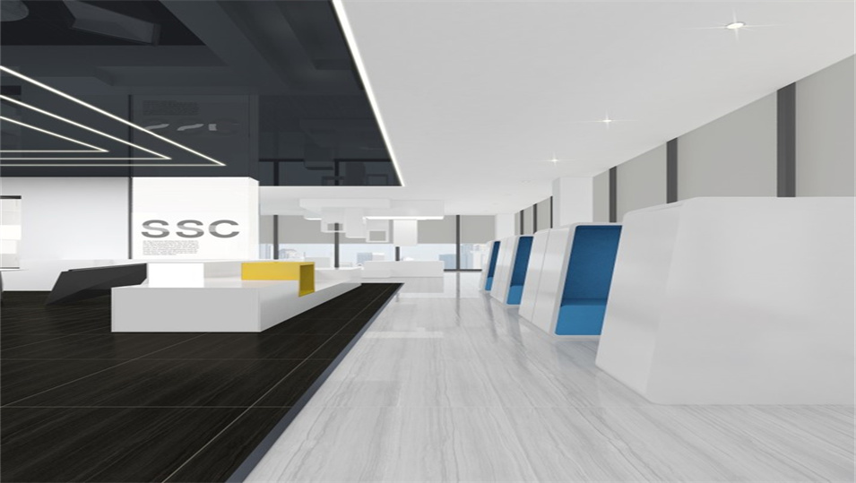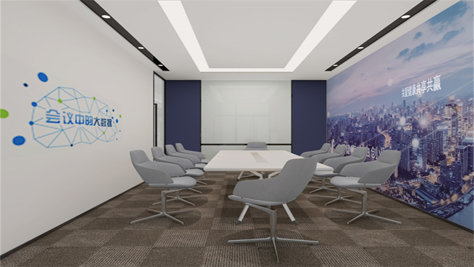 设计介绍:主要展示前台、洽谈区、走廊、贵宾区、会议室、办公区等各个区域实物图,设计师们采用现代简约风格办公室设计,主要以白色为主,蓝色更符合智能化科技的公司形象,通过几何图形与条纹装饰打造科技智能的办公空间。